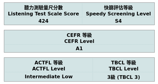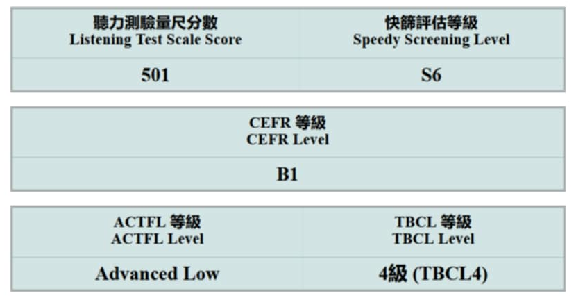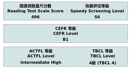 In the end, you get to to immediately see your results. The results are divided into 5 different scales. First off is the reading test scale score, second is the speedy screening level which is S1-S10, the CEFR level, ACTFL level as well as the TBCL level.